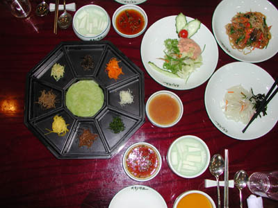 ガイドのパクさんの勧めで、夕食はパッケージオプションの韓定食レストランへ。写真は最初に出てくるチンクジョル(九節板)。小麦粉と卵で薄く焼いた皮(中心)に、肉、野菜、卵などで出来た具を包んで食べる。五色五味の思想。この後、魚介、肉、穀物、野菜、果物、菓子などいろいろな料理のオンパレード。それぞれ見た目とバライエティの楽しさはあるものの、味については今ひとつピンとこないのは、日本人故か。水キムチ(写真の下中央部)は塩水につけた短冊に切った大根。味噌汁は味が濃すぎて口に合わない。ごま油を使った料理が多い。それにしてもゆでた馬鈴薯のマヨネーズ和え(普通にいうとポテトサラダ)がよくでてくるが、こんなもの昔はなかったはずだがいつのまにか韓国料理に仲間入りしている。
