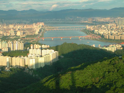 最初の夕食は市内の焼肉屋さん。日本の観光雑誌で紹介している多くのお店から南大門市場に近い北倉洞の「ハニャン(漢陽)チュムロッ」を選んだ。雑誌の肉の見事な写真で選んだ。店のカンバンのおばさんはお姉さんが在日とのこと。このお店の特長はどんぐりの木の炭、こまかく刻んだネギを酢と醤油味の出汁で。季節がらすっぱいキムチについてのお話し。 それに冷麺と石焼ビビンパッ。結局焼肉は他の料理よりかなり高くことが分った。ちなみにおばさんは「るるぶ」がなぜ「るるぶ」であるのかを知っていた。私たちの持っていった「まっぷる」も良くご存知。両方の雑誌のどの版にもこのおばさんの元気な姿が載っている。食後、ナンデモン(南大門)市場を抜けて、ミョンドン(明洞)から、ナムサン(南山)公園まで腹ごなしに歩く。公園の手前で高速道路を渡るところがなく、大回りをして、急な坂と階段でケーブル乗り場に到着。そこからまたどういうわけかケーブルカーのプラットフォームまでまた階段。そう言えばソウルには道路の歩道が少なく、地下鉄や地下道が多いのにエスカレータが殆どない。お年寄りや身体障害者には不便な町のつくりとなっている。滞在中に車椅子の人を見なかったし、街中にはお年寄りを殆ど見かけなかった。ソウルは若い人とビジネスマンの街。ソウルタワーに上った。おりしも夏休みで日曜日とあって、多くの人が南山公園とこのタワーで夕涼み。タワーはソウルの町と、その郊外を360度展望できる。遠からず北西に見える海岸や島々は遠い国、北朝鮮。強い西日にマンション群が漢江に映える。狭いソウル市域に600万人を抱える。