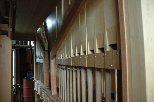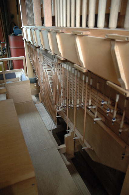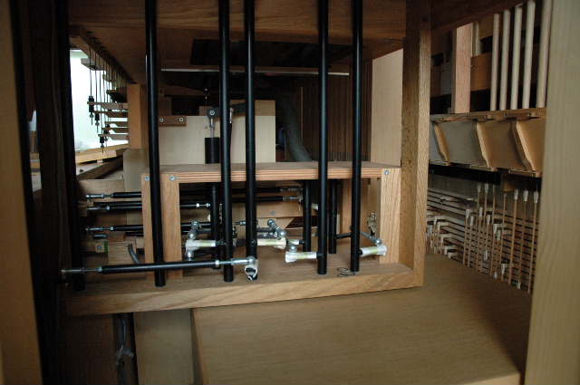 ストップのリンク機構 左奥上部に前面パイプ列用のトラッカー(弁引き棒)が見える |