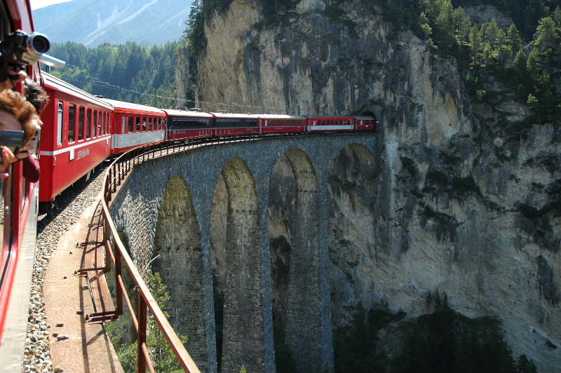 氷河特急でサンモリッツからツェルマットへ。 岸壁のトンネルから出ると高い石の橋 |