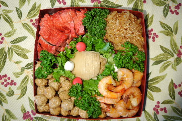 | 1月 30年以上も毎年お願いしている高輪・菜香亭の中華おせち 鮑、海月、海老、肉団子、鶏叉焼が一杯詰まっている |