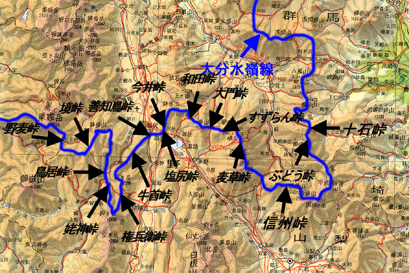 2006年10月18日追記 好天気の10月12日と13日、オートバイで福島県の中央分水嶺の9つの峠を越える旅をした。 中央分水嶺は福島県北部では、荒々しい火山の吾妻連山と、それを南に下ると、会津と安積を隔てている比較的高度の低い嶺々である。 白河と会津を結ぶ県道37号線(白河羽鳥線)が分水嶺を越える真名子峠から南はより厳しい山岳になり、甲子峠は未だに自動車では越えることができない。 盆地の会津は周辺との交通には必ず「峠」が介在する。その地勢が会津の文化的、政治的特徴を形成したといえる。 会津は明治維新の戊辰戦争では母成峠などでの戦役でついにその孤高の独立性が失われ、明治以降の度重なる交通路の開発を経て今に至ったことを思えば、会津は「パスハンター」を惹きつけてやまない。 7月13日再改訂 青字部分 「塩尻峠と善知鳥峠の間の塩嶺高原別荘地のあたりは大規模開発で中央分水嶺のある丘陵地が削り取られてしまった」、と書いたが、2万5千分の1の地図で詳細に調べたところ、別荘地は分水嶺の南側斜面に造られており、もともとの分水嶺は手がかけられておらず、もとのままであることを確認した。 また、連続した航空写真を使って、この部分の高低が立体的に見えるように3Dステレオ写真を作成した。これはステレオビューアを直接パソコンの画面に当ててこの空から見下ろしたこの土地が立体的に見える。航空写真の撮影間隔と実際の両眼の幅が極端に異なるから高低差が誇張されて見え、里山がグランドキャニオンのように見えるのはご愛嬌。 2006年7月改訂の辞 2006年の6月から7月にかけて2度にわたって、オートバイで長野県の分水嶺とそれを越える峠を辿る旅にでた。そして帰って調べてみると、昨年の12月に書いた文章に多くの誤解と無知による間違いが散見されたので、それらを補正した。ひとつは、分水界が動くことの原因として火山活動と大規模工事と書きましたが、他に自然活動で「河川争奪」という現象で分水界が移動することが結構あるということを認識した。また道路地図では分水嶺が分かりづらかった塩尻峠と善知鳥峠の間、白樺湖・霧ヶ峰、野反湖のあたりは、実際に行ってみて分水嶺(界)とそれを越える峠の位置を確認し、また航空写真や2万5千分の1の地図でも確認した。 2005年6月のオートバイによるヨーロッパアルプスの峠越えの旅行では、ヨーロッパ大分水嶺(分水界とも)にこだわった。降った雨が北海に流れるのか、地中海に流れるのか、黒海に流れるのかを決める嶺に惹かれ、その嶺を越える峠の数々に挑戦した。 さて、日本列島における日本海と太平洋水域を分ける嶺や流域境界を「中央分水嶺(分水界)」という。山岳地帯ではこれらの分水嶺(界)(divide, watershed)のうち一番低い地点(もっと正確に言うと、歩いている尾根・山稜などの標高の変化がマイナスからプラスに転ずる地点)の多くは、街道や林道が越える「峠」(すなわち、道の方から見ると標高の変化がプラスからマイナスに転ずる地点)となる。 「最も低くて最も高いのなあに?」というクイズの解答となる「峠」というポイントは数学・物理学上で「特異点」と呼ばれ珍重される。 これらの中央分水界を越える峠の内、車かオートバイで通れる峠の数は、果たしていくつあるだろうか、と考えている内に「中央分水嶺(界)の全峠および横断道路の走破」を思いついた。最初は自動車かBMWオートバイで通れる峠や道に限り、将来はオフロードのバイクや自転車で林道の峠を加え、次にハイキングで登れる峠、そして、さらに峠と峠を結ぶ分水嶺の一部縦走へと広げ、そして、そして、不可能ではあるが、中央分水嶺(界)の全線縦走へと夢だけは膨らむ。