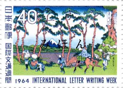 前面に東海道と、往来する駕籠や馬、旅人たちを描き、松並木越しには富士山が遠望される。 |